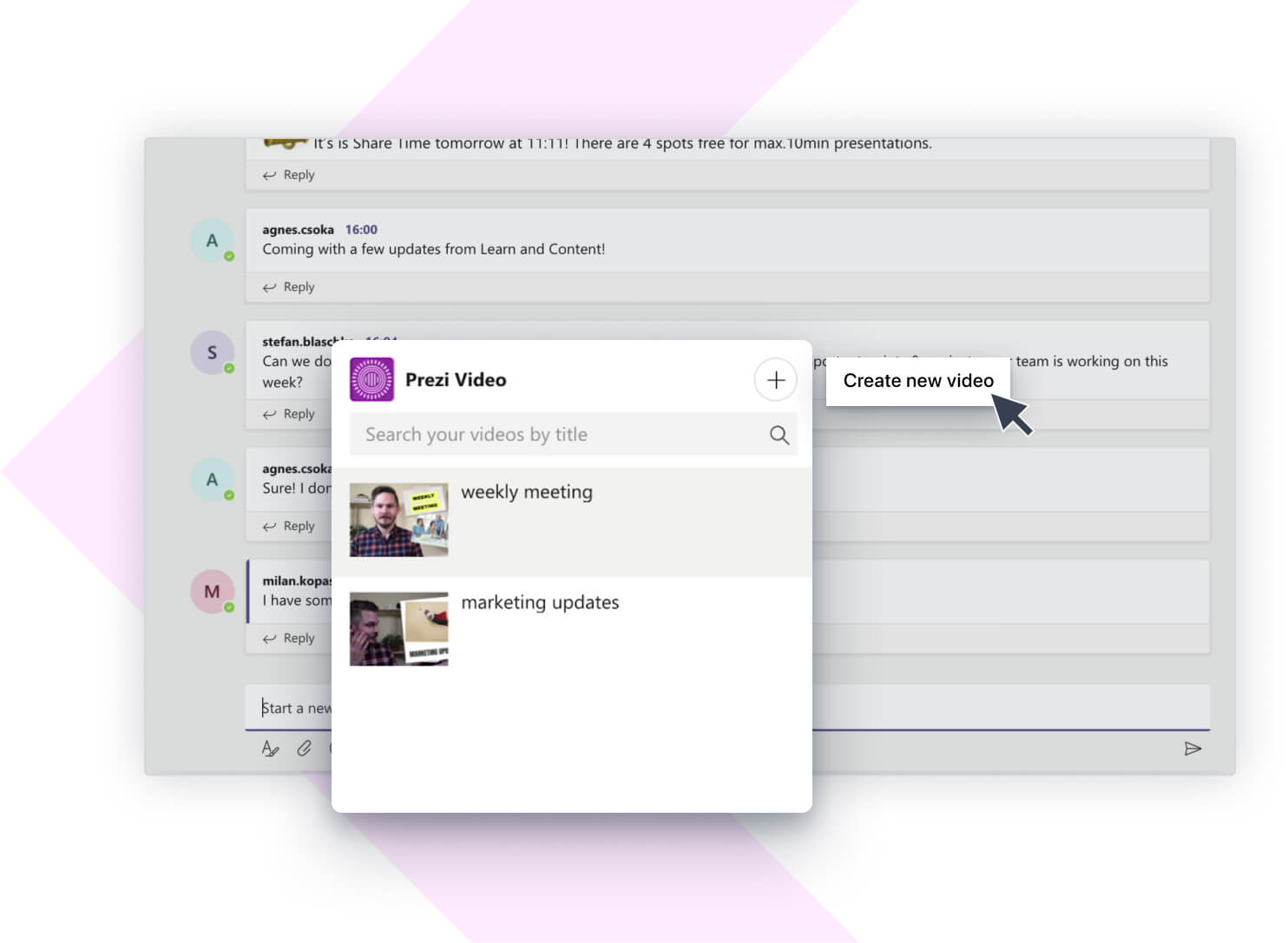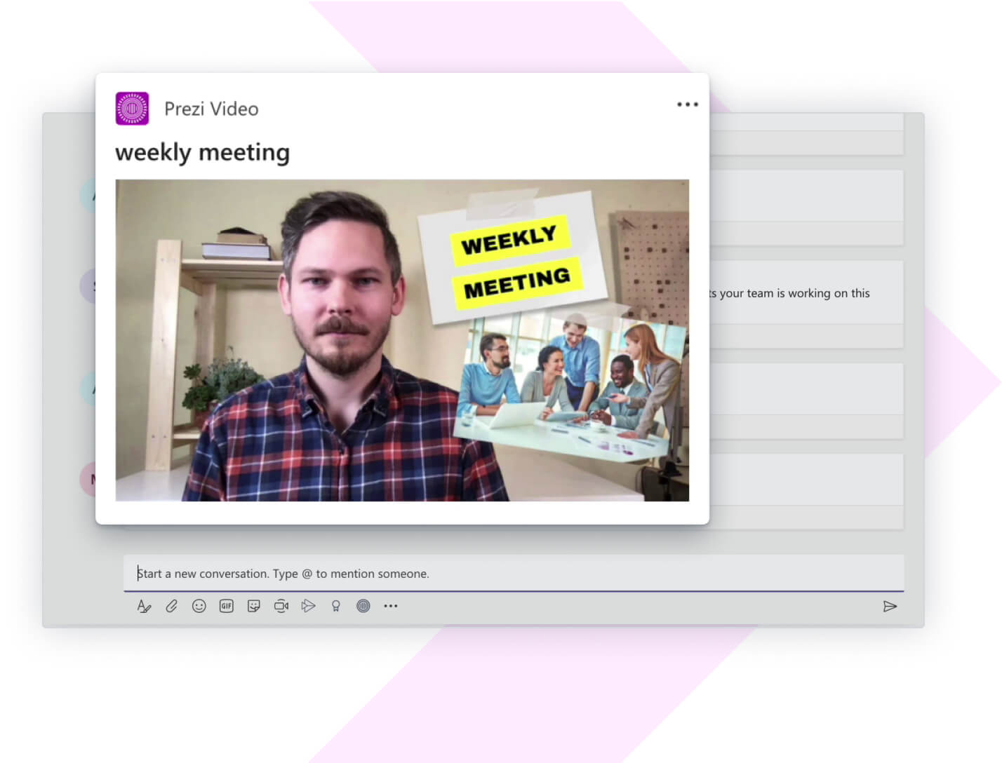 Puoi trovare e installare l'app Prezi Video nell'app store di Microsoft Teams. Vedrai quindi l'integrazione di Prezi Video disponibile nelle chat e nei messaggi di gruppo. Accedi al tuo account Prezi o creane uno con il tuo account Microsoft esistente: è facile e gratuito. Ora sei pronto per iniziare a creare video!