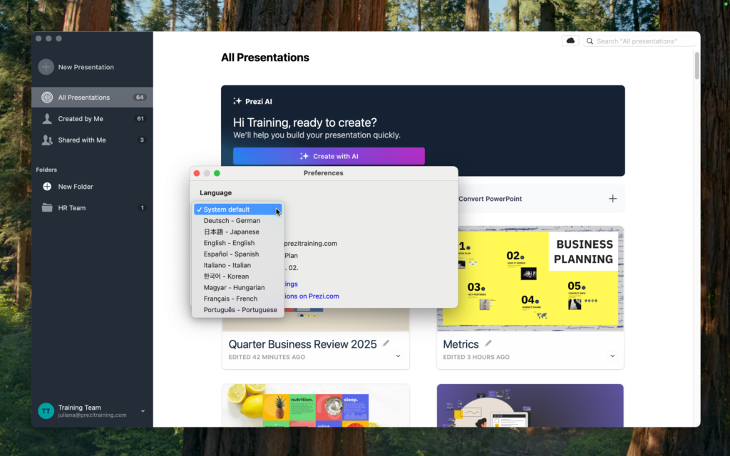 Once you change to your preferred language in Prezi, the update happens automatically across all online editors, including Prezi Present, Prezi Video, and Infographics.
