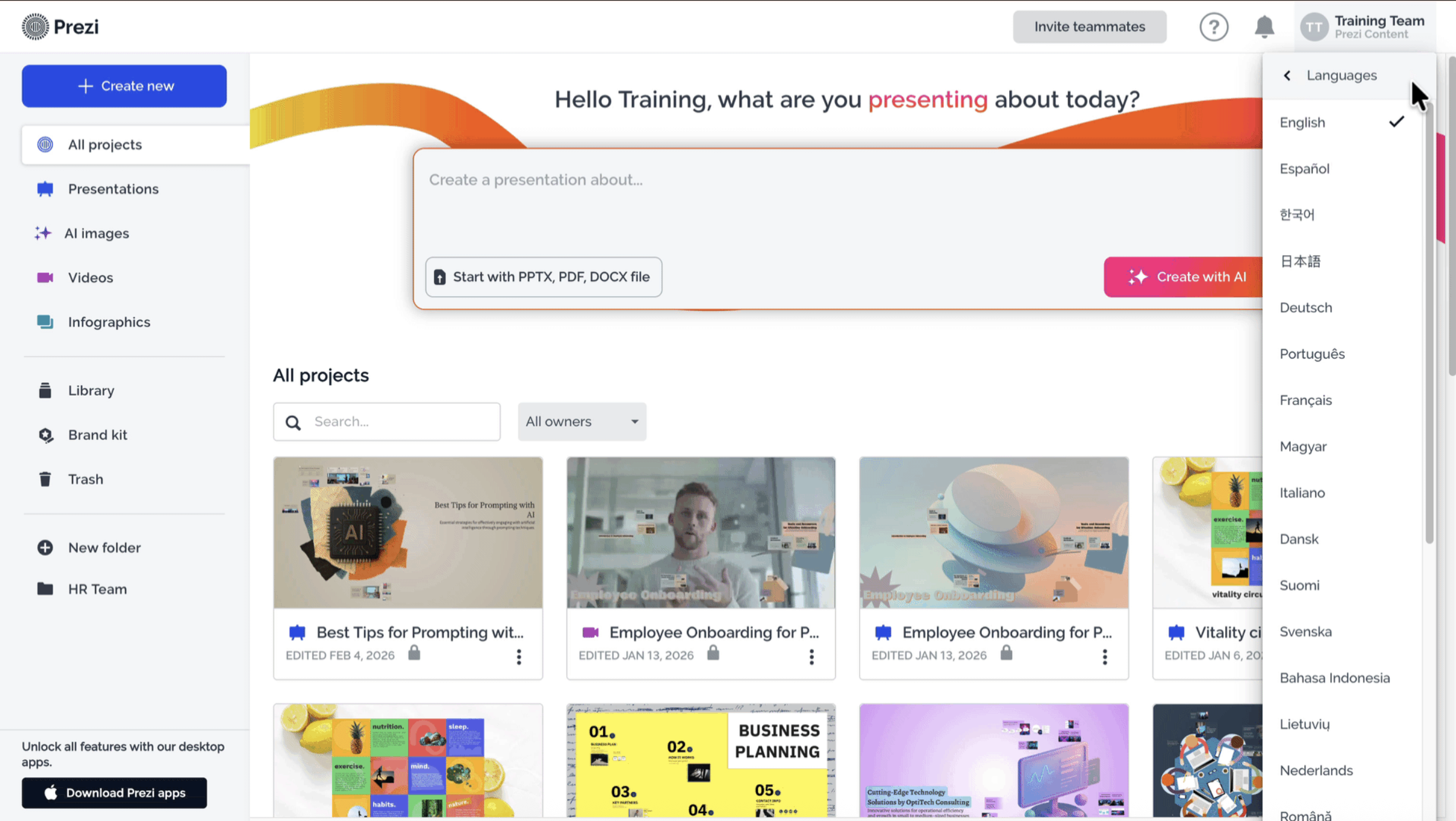 Prezi Present is available in multiple languages, making it easy to create, edit, and deliver presentations in the language you’re most comfortable with. This guide walks you through the supported languages and shows you exactly how to change language in Prezi directly from your dashboard.