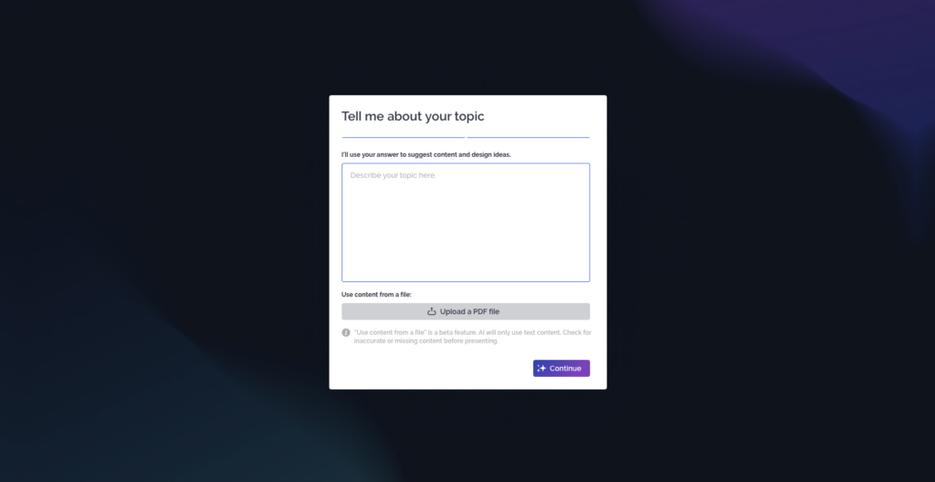All you need to do after clicking on "Create with AI" is enter a presentation title and add a description or upload a PDF file (optional). Here's the process: