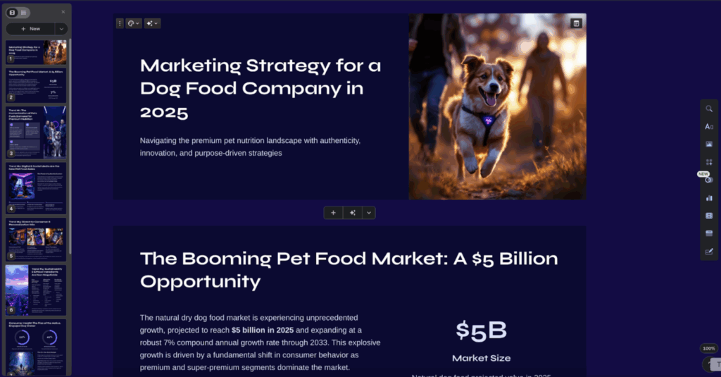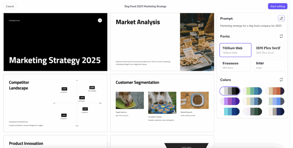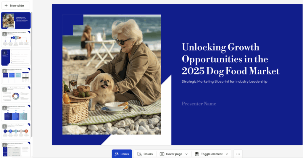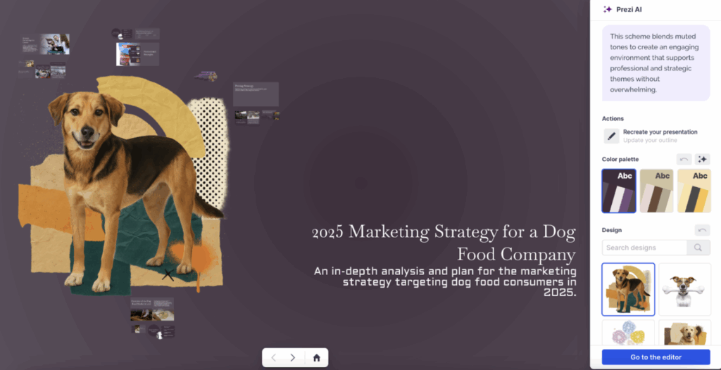 With Prezi AI, you can generate a complete presentation with a single prompt in seconds. I used the following prompt “create a marketing strategy for a dog food company” and Prezi AI instantly produced a clean, well-structured outline with visuals. From there, you can refine the content, adjust colors, and choose from a range of design themes.