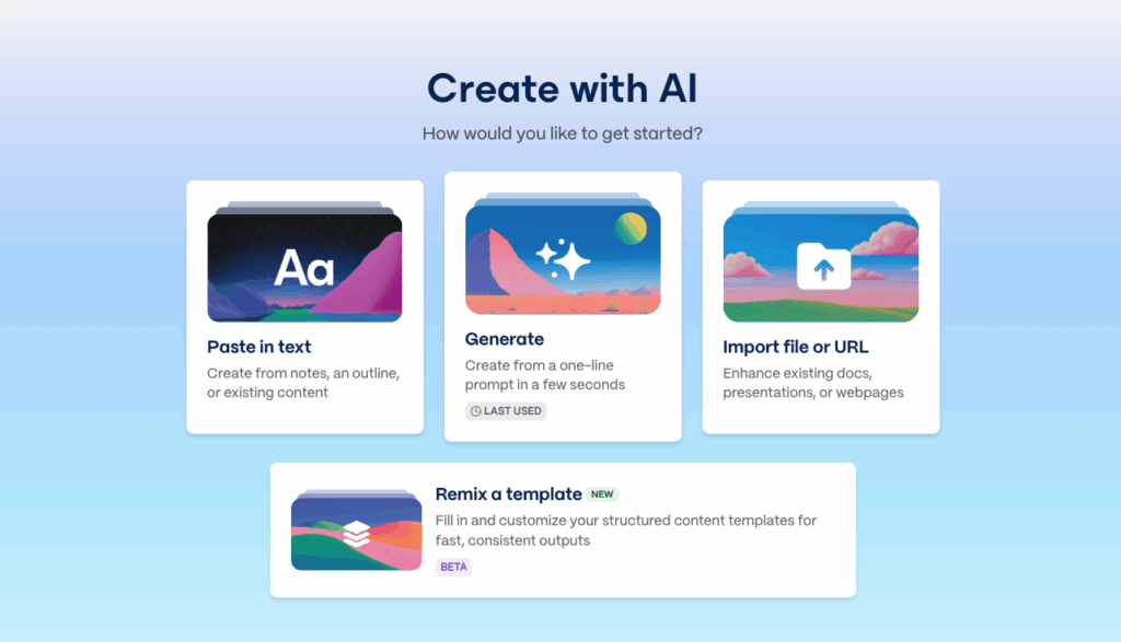Known for its user-friendly interface, Gamma allows users to quickly generate presentations. Gamma refers to their slides as "cards", which are more like sections within a page.