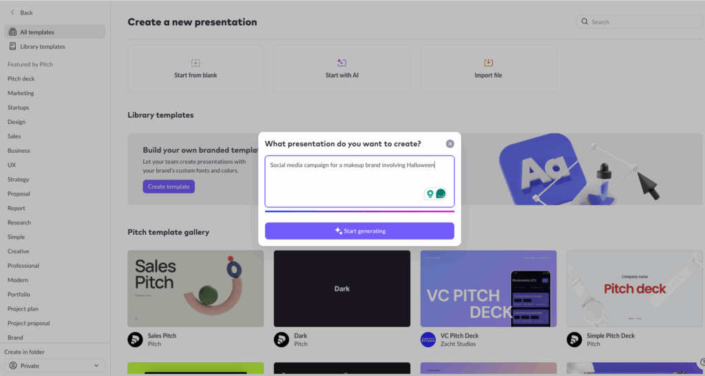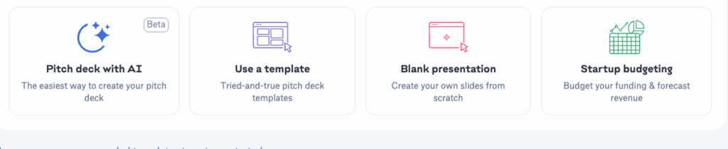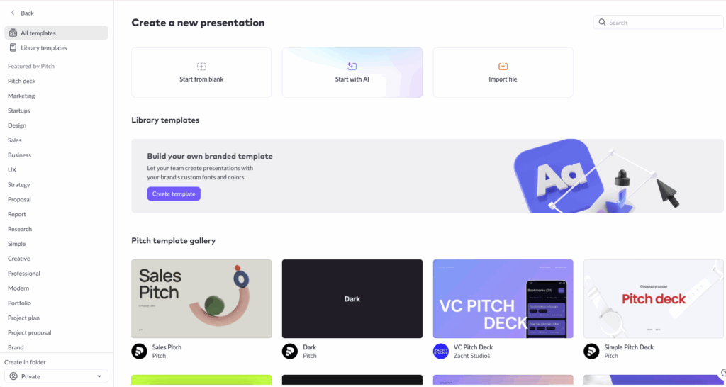 There are three ways to get started in Pitch: either by starting from scratch, using AI, or importing a file.
