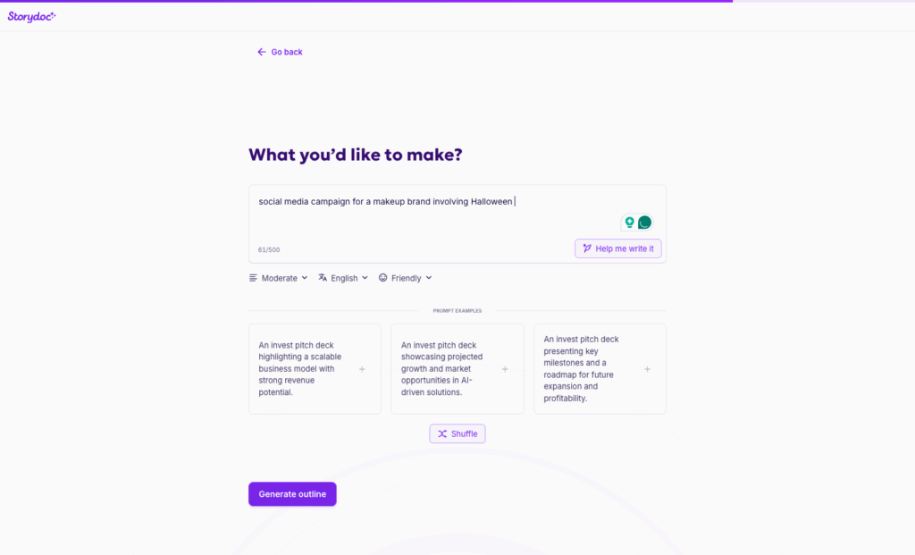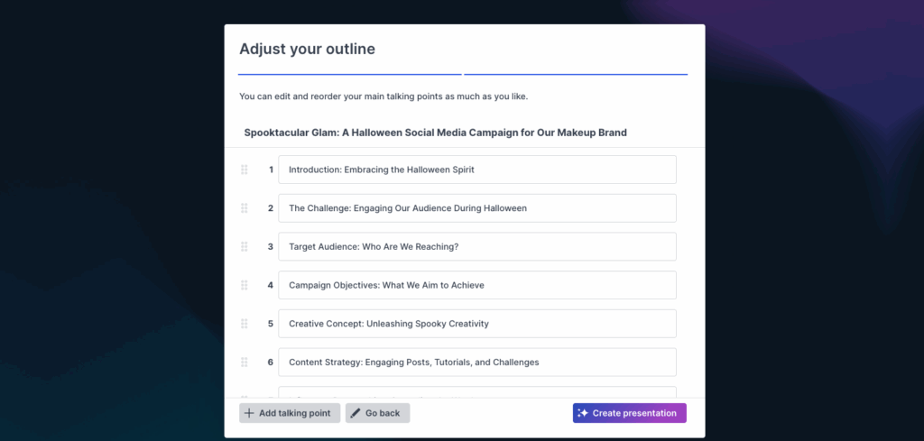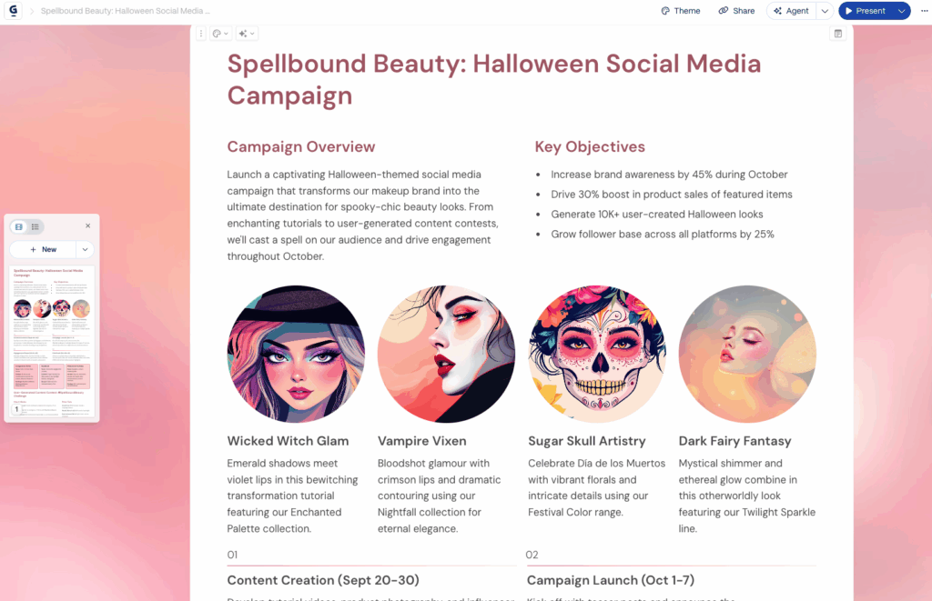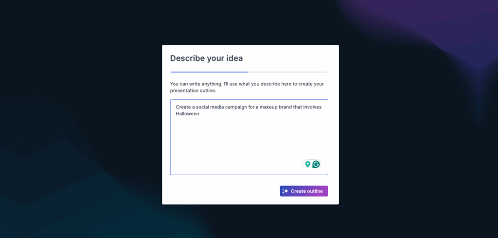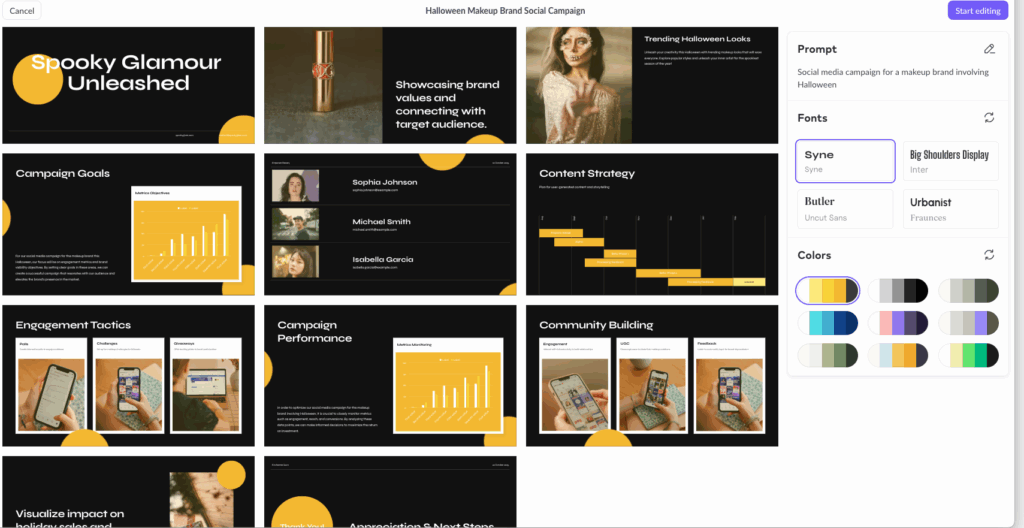 Before exploring different AI pitch deck generators, we took the time to define our presentation goals. Knowing your objective—whether it's securing funding, closing deals, or educating your audience—will help you choose a tool tailored to those specific goals. We decided to put in the same prompt to all tools, asking them to create a social media campaign for a makeup company for Halloween.