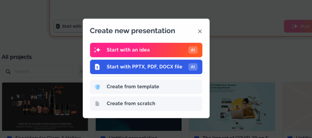 - Convert PDFs, PPTX, DOCX, or other files into a presentation
