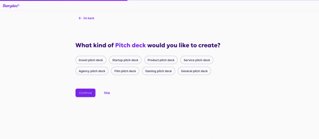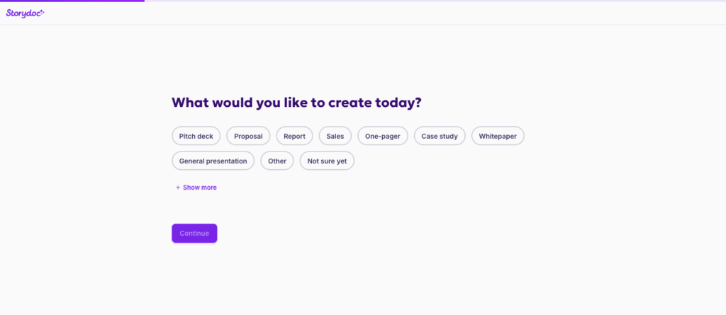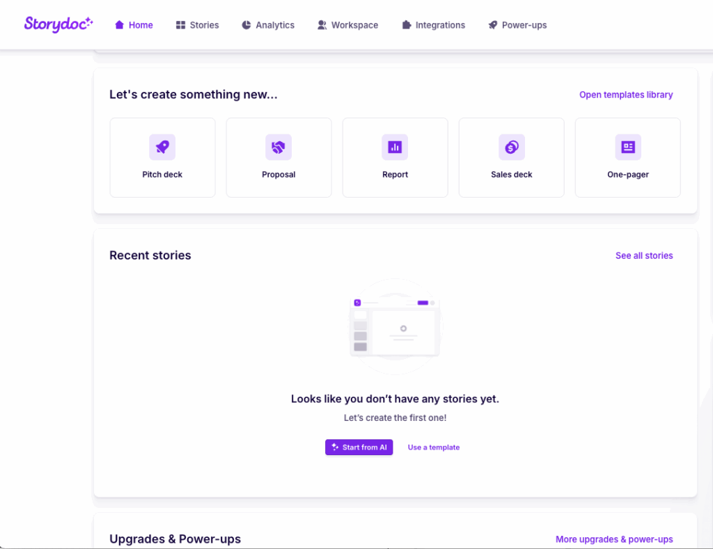 Storydoc is an AI presentation tool that can be used to create decks or business documents. But instead of referring to their finished product as a slide deck, they refer to their content as stories. Before you begin creation, it offers you a wide variety of options for what you want to create.