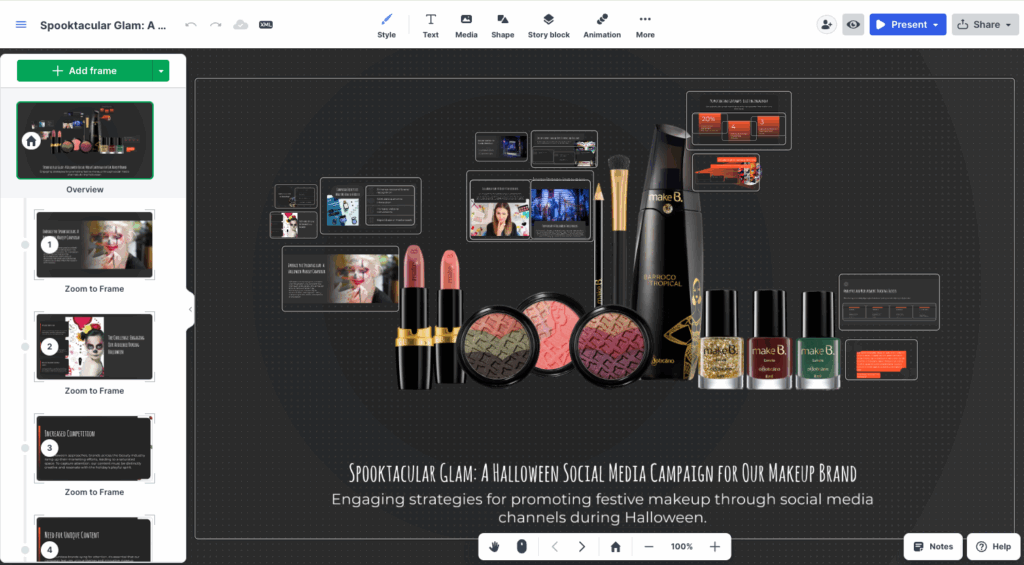 After I took a look at the outline, Prezi AI created the presentation. I was impressed with the AI-generated visuals that were included and the motion-based layout. It allowed me to take my audience on a journey as I walk through the campaign.