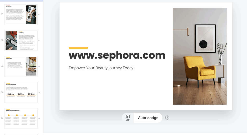 It immediately created a presentation based on the website I provided. There was no room to add additional content before it generated a pitch deck. Slidebean is only a good solution for pitching a company, and not for pitching campaigns or projects.