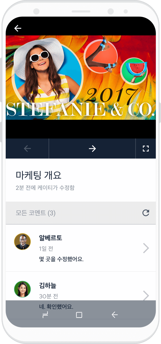 하나의 파일 안에서 코멘트를 달고 협업을 해보세요. 간단한 링크로 프레지를 공유할 수도 있습니다. 링크를 보내고 누가 볼 수 있는 권한이 있는지 통제할 수 있습니다.