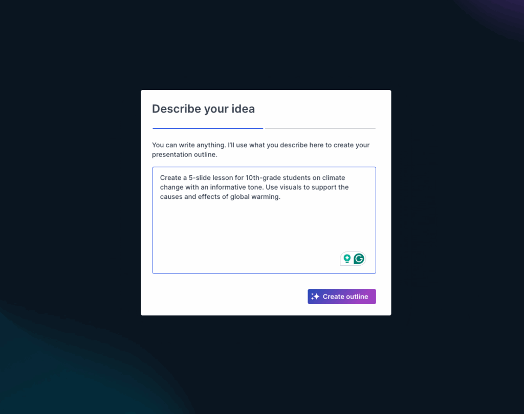 Example: “Create a 5-slide lesson for 10th-grade students on climate change with an informative tone. Use visuals to support the causes and effects of global warming.”